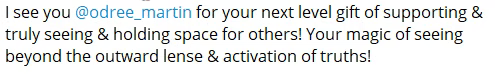 Odree leads “that inner work, that transformation, that energetic confirmation of what we’re bringing to life, that allows us to put all these tangible pieces together, and she also serves those up to you on a silver platter in a way that feels so affirming to your soul, I mean, it’s powerful”.